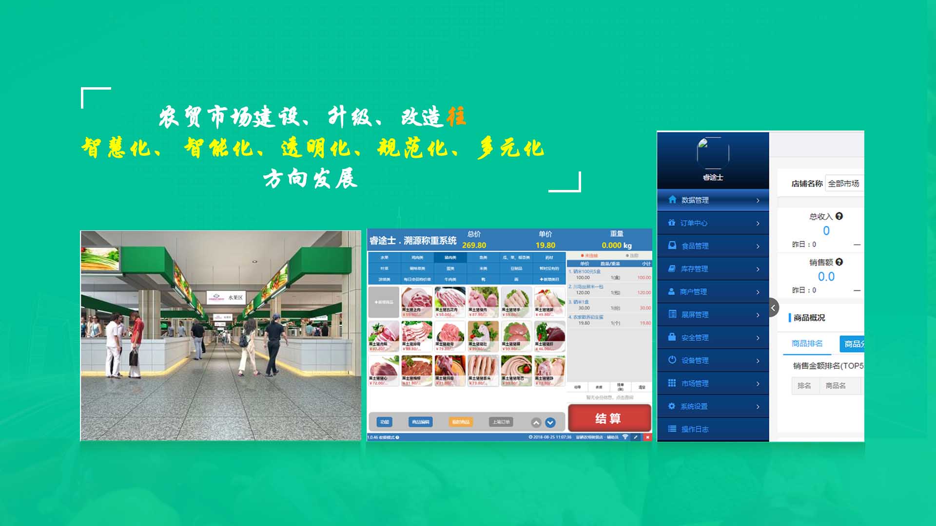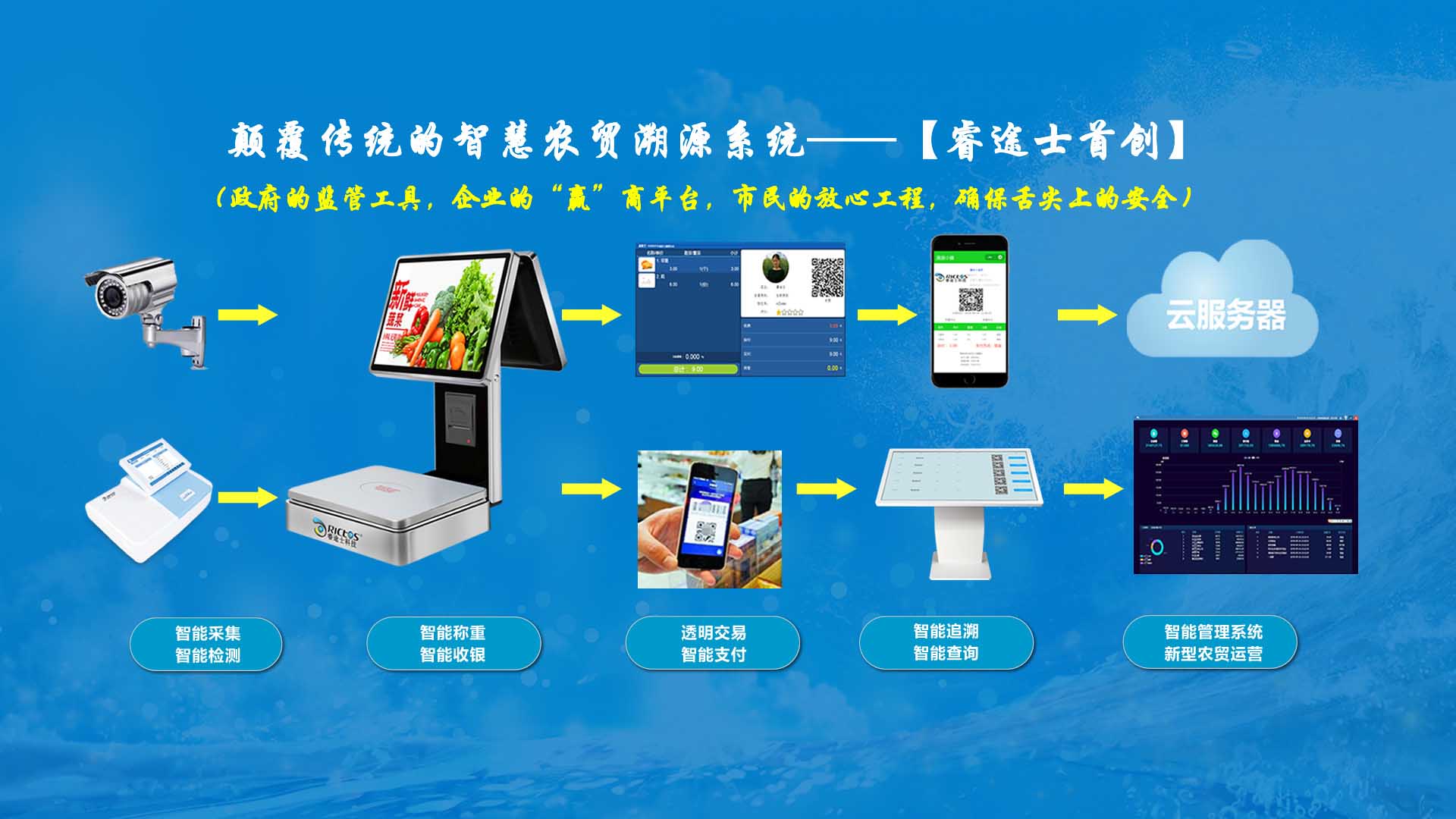 創(chuàng)新實現了【智慧農貿溯源管理系統(tǒng)】與【智能稱重收銀】一體化解決方案,集市場管理、運營管理、溯源追溯、智能收銀大數據運用于一體,硬件、軟件與管理系統(tǒng)完美結合。適用于農批、農貿市場蔬菜、生鮮、水果、水產、肉類、熟食等稱重和非稱重銷售;由于采用一體化設計,解決了傳統(tǒng)農貿市場無法實現的信息化、智能化、可追溯的管理問題;使稱重、收銀、追溯、管理、更透明、公正、安全,讓顧客無后顧之憂,給管理工作帶來極大的便捷與高效,對國內農產品行業(yè)的發(fā)展、農產品流通管理起到了典范作用。 【睿途士首創(chuàng)】顛覆傳統(tǒng)的“智慧農貿市場系統(tǒng)”,解決了傳統(tǒng)農貿系統(tǒng)單一安卓掛屏,昂視不方便看、不直觀、無互動性,傳輸信息不齊全、不穩(wěn)定的問題,也解決了按鍵電子秤商品難找、商品代碼難記、按鍵操作不靈活、支付不智能,對收銀管理、銷售商品、菜名、菜價、打折、優(yōu)惠、會員、線上下單、采購等無法實現實際菜品交易和追溯等問題。 更具顛覆性的是睿途士智慧系統(tǒng)擁有三大管理平臺(市場管理平臺、總部運營管理平臺、商戶后臺管理平臺)、一個可視操作前臺和三大追溯功能,讓遠程管理、數據傳輸、人機互動、智能控制、移動支付、大數據、互聯(lián)通信、云端存儲、人工智能、智能城市、電子定位、智能收銀等功能得以實現。